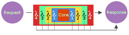 which is our "program" and four middlewares identified by the "lambda" symbol, a color and a number (which indicates the order in which it was added). As a side note you'll normally see examples of middlewares implemented as lambda functions (thus the symbol) but in fact any callable would do just as good.